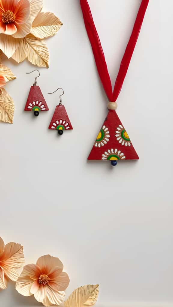 Add a bold and artistic touch to your style with this handcrafted terracotta jewelry set. Designed with a unique triangular pendant and matching earrings, the set is beautifully hand-painted with vibrant floral motifs in white, yellow, and green on a striking red base. The red thread necklace enhances its traditional appeal, making it a perfect statement piece for festive and ethnic occasions.