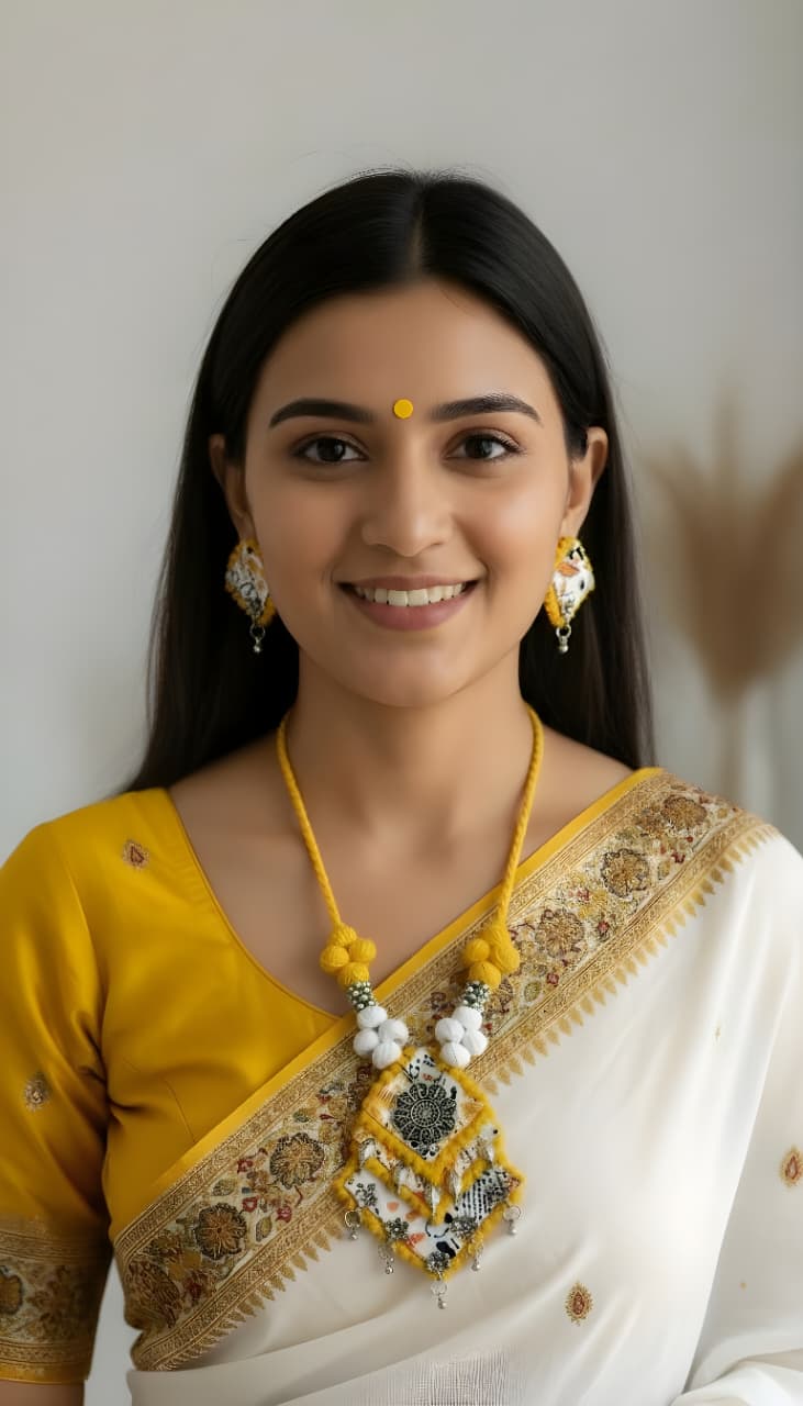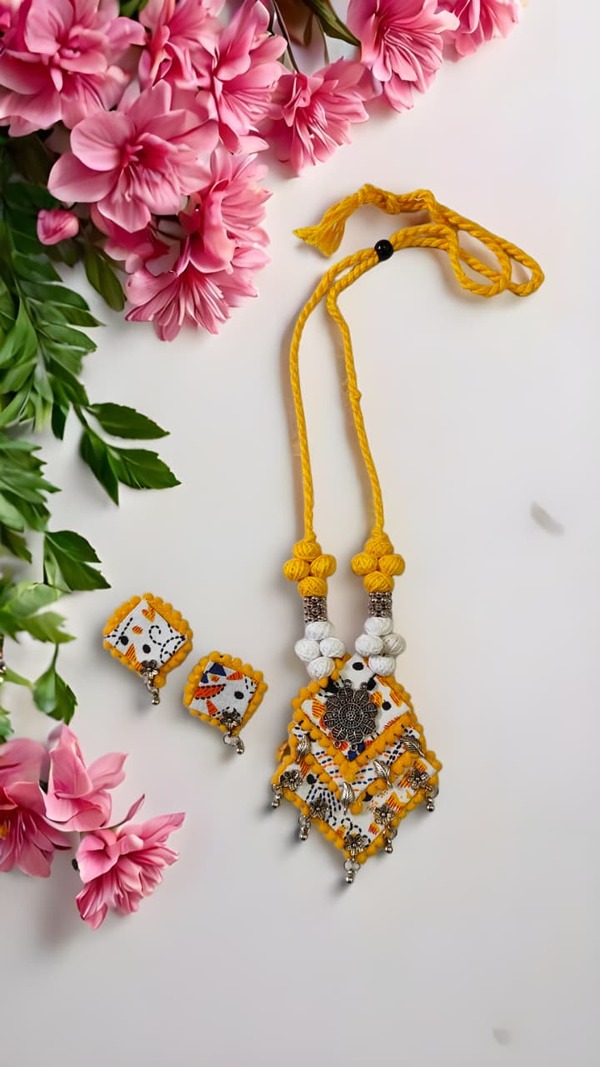 This handcrafted fabric jewelry set beautifully blends tradition with elegance. The bright yellow & white fabric base is decorated with intricate thread work and oxidized silver charms, giving it a unique and vibrant look. The necklace comes with an adjustable closure for all-day comfort, paired with matching square earrings to complete your ethnic ensemble.